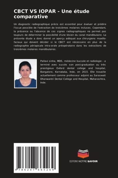 Un diagnostic radiographique précis est essentiel pour évaluer et prédire l'issue possible de l'extraction de troisièmes molaires incluses. Cependant, la présence ou l'absence de ces signes radiographiques ne permet pas toujours de déterminer la possibilité d'une lésion du canal mandibulaire. La présente étude a donc donné un aperçu adéquat aux chirurgiens maxillo-faciaux qui doivent décider si le CBCT est nécessaire en plus de la radiographie périapicale intra-orale préopératoire dans les extractions de troisièmes molaires mandibulaires.