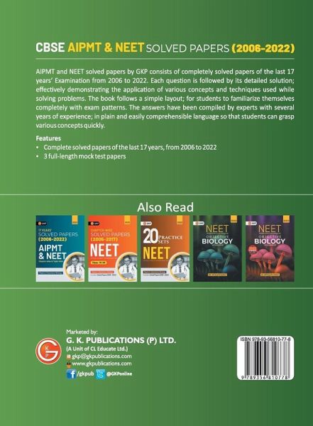 AIPMT & NEET solved papers by GKP consists of completely solved papers of the last 17 years' examinations from 2006 to 2022. Each question is followed by its detailed solution; effectively demonstrating the application of various concepts and techniques used while solving problems. It also includes 3 full-length mock tests as per the latest pattern. The book follows a simple layout; for students to familiarize themselves completely with exam patterns. The answers have been compiled by experts with several years of experience; in plain and easily comprehensible language so that students can grasp various concepts quickly. Features: Completely solved papers of the last 17 years, from 2006 to 2022 3 full-length practice sets.