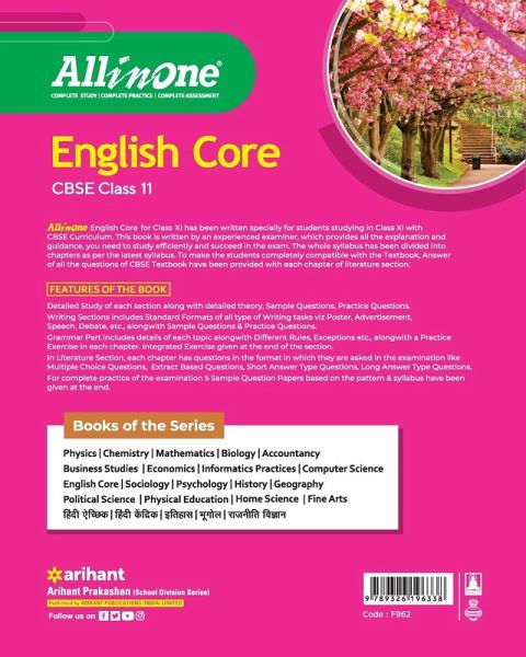 Arihant's "All in One" is no new name today. One of the Best-Selling Series that is helping students with their school and board exams preparation by providing Complete Theory, Practice, and Assessment as per new issued pattern for the excellent academic results. The freshly updated 2022-23 edition of "All in One English Core for Class 11" is a self-study guide that has been carefully and consciously revised by providing proper explanation & guidance and strictly following the latest CBSE Syllabus as prescribed by the Board. It has been written in such a way that the students will be fully guided to prepare for the exams in the most effective manner and secure higher grades. It constitutes all the key concepts in each distinctive chapter in an explanatory manner for a better understanding. The book not only focuses on imparting theoretical knowledge but also on enhancing the revision and practice level. It has all the materials required for Learning, Understanding, Practice & Assessment and will surely guide the students on the way to success. This book inhibits: 1. 'All in One' - Best Selling Series from class 6th -12th 2. Covers complete theory, Practice, and Assessment of English Core for Class 11 with solved examples 3. Divided into 3 sections giving full coverage to the syllabus 4. Each chapter is supported by detailed theory, illustrations, and all types of questions 5. Special focus on New Pattern Objective Questions 6. Every chapter accompanies Chapter Practice for quick revision 7. Supplemented with all types of questions 8. Objective questions in the Reading & Literature sections 9. Assertion- Reason and Case-Based Questions 10. Sample Papers for thorough revision Table of Contents Reading Skills, Writing Skills & Grammar, Literature Textbooks, Assessment of Speaking & Listening Skills, Sample Question Papers [1-5]