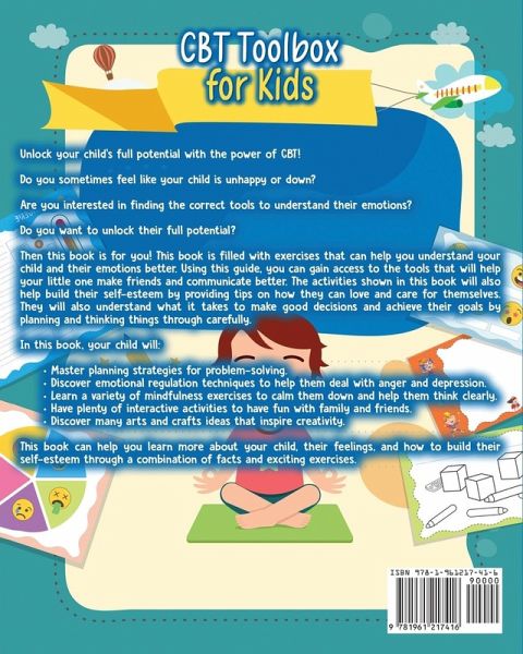 Unlock your child's full potential with the power of CBT! Do you sometimes feel like your child is unhappy or down? Are you interested in finding the correct tools to understand their emotions? Do you want to unlock their full potential? Then this book is for you! This book is filled with exercises that can help you understand your child and their emotions better. Using this guide, you can gain access to the tools that will help your little one make friends and communicate better. The activities shown in this book will also help build their self-esteem by giving you tips on how they can love and care for themselves. They will also understand what it takes to make good decisions and achieve their goals by planning and thinking things through carefully. In this book, your child will: Master planning strategies for problem-solving Discover emotional regulation techniques to help them deal with anger and depression Learn a variety of mindfulness exercises to calm them down and help them think clearly Have plenty of interactive activities to have fun with family and friends. Discover many arts and crafts ideas that inspire creativity This book can help you learn more about your child, their feelings, and how to build their self-esteem through a combination of facts and exciting exercises.