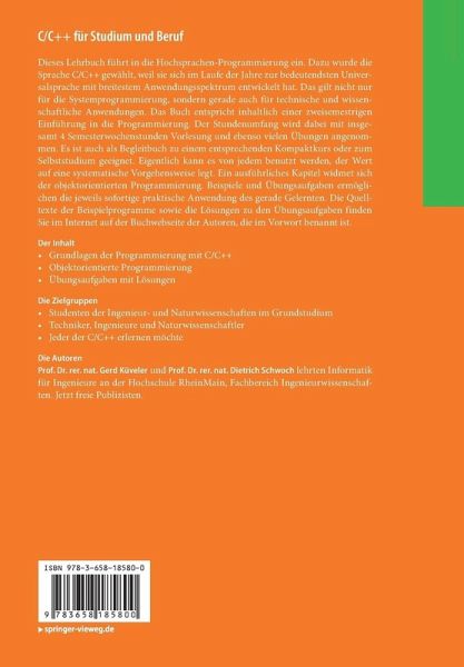 Dieses Lehrbuch führt in die Hochsprachen-Programmierung ein. Dazu wurde die Sprache C/C++ gewählt, weil sie sich im Laufe der Jahre zur bedeutendsten Universalsprache mit breitestem Anwendungsspektrum entwickelt hat. Das gilt nicht nur für die Systemprogrammierung, sondern gerade auch für technische und wissenschaftliche Anwendungen. Das Buch entspricht inhaltlich einer zweisemestrigen Einführung in die Programmierung. Der Stundenumfang wird dabei mit insgesamt 4 Semesterwochenstunden Vorlesung und ebenso vielen Übungen angenommen. Es ist auch als Begleitbuch zu einem entsprechenden Kompaktkurs oder zum Selbststudium geeignet. Eigentlich kann es von jedem benutzt werden, der Wert auf eine systematische Vorgehensweise legt. Ein ausführliches Kapitel widmet sich der objektorientierten Programmierung. Beispiele und Übungsaufgaben ermöglichen die jeweils sofortige praktische Anwendung des gerade Gelernten. Die Quelltexte der Beispielprogramme sowie die Lösungen zu den Übungsaufgabenfinden Sie im Internet auf der Buchwebseite der Autoren, die im Vorwort benannt ist.