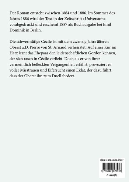 Theodor Fontane: Cécile. Roman Lesefreundlicher Großdruck in 16-pt-Schrift Der Roman entsteht zwischen 1884 und 1886. Im Sommer des Jahres 1886 wird der Text in der Zeitschrift »Universum« vorabgedruckt und erscheint 1887 als Buchausgabe bei Emil Dominik in Berlin. Die schwermütige Cécile ist mit dem zwanzig Jahre älteren Oberst a.D. Pierre von St. Arnaud verheiratet. Auf einer Kur im Harz lernt das Ehepaar den leidenschaftlichen Gordon kennen, der sich rasch in Cécile verliebt. Doch als er von ihrer vermeintlich befleckten Vergangenheit erfährt, provoziert er voller Misstrauen und Eifersucht einen Eklat, der dazu führt, dass der Oberst ihn zum Duell fordert. Großformat, 210 x 297 mm Berliner Ausgabe, 2019 Durchgesehener Neusatz mit einer Biographie des Autors bearbeitet und eingerichtet von Theodor Borken Entstanden 1884/85, Erstdruck in: Universum (Dresden), März-September 1886. Textgrundlage ist die Ausgabe: Theodor Fontane: Romane und Erzählungen in acht Bänden. Herausgegeben von Peter Goldammer, Gotthard Erler, Anita Golz und Jürgen Jahn, 2. Auflage, Band 4, Berlin und Weimar: Aufbau, 1973. Umschlaggestaltung von Thomas Schultz-Overhage unter Verwendung des Bildes: Robert Henri, Jessica Penn, 1907. Gesetzt aus der Minion Pro, 16 pt. Henricus Edition Deutsche Klassik UG (haftungsbeschränkt)