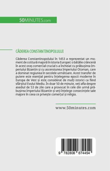 C¿derea Constantinopolului în 1453 a reprezentat un moment de cotitur¿ major¿ în istoria Europei: o b¿t¿lie crâncen¿ în acest orä comercial crucial s-a încheiat cu pr¿bu¿irea Imperiului Bizantin ¿i cu ascensiunea Imperiului Otoman, care a dominat regiunea în secolele urm¿toare. Acest transfer de putere este esen¿ial pentru în¿elegerea epocii moderne în Europa de Vest ¿i este considerat de mul¿i istorici ca fiind sfâr¿itul Evului Mediu. În doar 50 de minute, ve¿i afla despre asediul de 53 de zile care a provocat în cele din urm¿ pr¿bu¿irea Imperiului Bizantin ¿i ve¿i în¿elege consecin¿ele sale majore în ceea ce prive¿te comer¿ul ¿i religia. Aceast¿ carte simpl¿ ¿i informativ¿ ofer¿ o discu¿ie am¿nun¿it¿ despre contextul c¿derii Constantinopolului, preg¿tirile pentru b¿t¿lie ¿i principalele evenimente ale b¿t¿liei. Include, de asemenea, biografii ale principalilor comandan¿i ¿i lideri, inclusiv ale influentului sultan otoman Mehmet al II-lea, o introducere valoroas¿ în contextul social ¿i politic ¿i o evaluare a consecin¿elor b¿t¿liei, oferindu-v¿ toate informäiile esen¿iale despre cucerirea Bizan¿ului.
