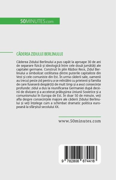 C¿derea Zidului Berlinului a pus cap¿t la aproape 30 de ani de separare fizic¿ ¿i ideologic¿ între cele dou¿ jum¿t¿¿i ale capitalei germane. Construit în plin R¿zboi Rece, Zidul Berlinului a simbolizat ostilitatea dintre puterile capitaliste din Vest ¿i cele comuniste din Est. În urma c¿derii sale, oamenii au trecut peste zid pentru a se reîntâlni cu prietenii ¿i familia de care fuseser¿ desp¿r¿i¿i de mult timp ¿i a avut consecin¿e profunde: zidul a dus la reunificarea Germaniei dup¿ decenii de divizare ¿i a accelerat pr¿bu¿irea Uniunii Sovietice ¿i a comunismului în Europa de Est. În doar 50 de minute, ve¿i afla despre consecin¿ele majore ale c¿derii Zidului Berlinului ¿i ve¿i în¿elege cum a schimbat dramatic politica european¿ la sfâr¿itul secolului XX. Aceast¿ carte simpl¿ ¿i informativ¿ ofer¿ o discu¿ie am¿nun¿it¿ a principalelor evenimente care au dus la c¿derea Zidului Berlinului ¿i a principalilor oameni implicäi, printre care Egon Krenz ¿i Günter Schabowski. Include, de asemenea, o introducere valoroas¿ în contextul politic, social ¿i economic ¿i o evaluare a consecin¿elor pe termen lung, oferindu-v¿ toate informäiile esen¿iale despre acest eveniment important.