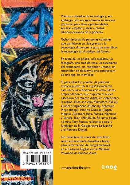 Vivimos rodeados de tecnología y sin embargo aún no apreciamos por completo su enorme potencial para abrir oportunidades, generar empleo y sacar a tantos latinoamericanos de la pobreza. Ocho historias de personas comunes que cambiaron su vida gracias a la tecnología alimentan la tesis de este libro: la tecnología es el código del futuro. Se trata de un policía, una maestra, un fotógrafo, una ama de casa, un estudiante del secundario, un reciclador urbano, un repartidor de delivery y una conductora de una app de movilidad. Si para ellos fue posible, ¡la próxima historia puede ser la tuya! Completan este libro las reflexiones de ocho líderes emprendedores, que explican el nuevo escenario del talento digital en Argentina y la región. Ellos son Alex Oxenford (OLX), Guibert Englebene (Globant), Sebastián Mejía (Rappi), Nelson Dubosq (Digital House), Alejandra Ripa, Patricia Martucci y Vanesa Taiah (Mindhub); más Toty Flores, el referente social y fundador de la Cooperativa La Juanita y el Potrero Digital. Las derechos de autor de este libro serán enteramente designados a becas para la formación de programadores en el Potrero Digital, en la Matanza, Provincia de Buenos Aires.