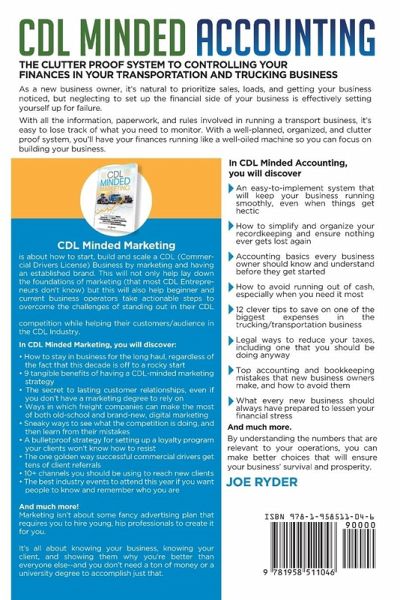 Avoid the Massive headaches of managing your business finances by following this effortless approach It's an exciting time to be part of the trucking industry--hauling over 80% of the country's total cargo, and projected to continue its strong performance in the years to come. As a new business owner, it's natural to prioritize sales, loads, and getting your business noticed. But neglecting to set up the financial side of your business is effectively setting yourself up for failure. Not knowing if you're running out of cash, or if your price covers all your costs, means that you don't know whether you're making money or not. And a business that doesn't keep tabs on how much money they're making (or losing) won't be able to survive that long. In fact, 85% of new trucking companies fail to reach their second year, partly due to problems with managing costs. If you don't want your business to end up the same way, it's essential that you're able to get your finances in order. However, with all the information, paperwork, and rules involved in running a transport business, it's easy to lose track of what you need to monitor. With a well-planned, organized, and clutter proof system, you'll have your finances running like a well-oiled machine so you can focus on building your business. In CDL Minded Accounting, you will discover:An easy-to-implement system that will keep your business running smoothly, even when things get hectic How to simplify and organize your recordkeeping and ensure nothing ever gets lost again Accounting basics every business owner should know and understand before they get started How to avoid running out of cash, especially when you need it most 12 clever tips to save on one of the biggest expenses in the trucking/transportation business Legal ways to reduce your taxes, including one that you should be doing anyway Top accounting and bookkeeping mistakes that new business owners make, and how to avoid them What every new business should always have prepared to lessen your financial stress And much more. Even if you have an accountant, it is still ultimately up to you as the business owner to make the financial decisions for your company. By understanding the numbers that are relevant to your operations, you can make better choices that will ensure your business' survival and prosperity. Take your finances seriously and give your business a better chance of succeeding.