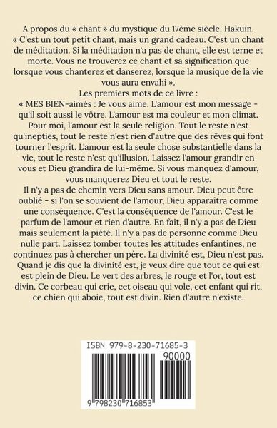 A propos du chant du mystique du 17ème siècle, Hakuin. C'est un tout petit chant, mais un grand cadeau. C'est un chant de méditation. Si la méditation n'a pas de chant, elle est terne et morte. Vous ne trouverez ce chant et sa signification que lorsque vous chanterez et danserez, lorsque la musique de la vie vous aura envahi . Les premiers mots de ce livre : MES BIEN-aimés : Je vous aime. L'amour est mon message - qu'il soit aussi le vôtre. L'amour est ma couleur et mon climat. Pour moi, l'amour est la seule religion. Tout le reste n'est qu'inepties, tout le reste n'est rien d'autre que des rêves qui font tourner l'esprit. L'amour est la seule chose substantielle dans la vie, tout le reste n'est qu'illusion. Laissez l'amour grandir en vous et Dieu grandira de lui-même. Si vous manquez d'amour, vous manquerez Dieu et tout le reste. Il n'y a pas de chemin vers Dieu sans amour. Dieu peut être oublié - si l'on se souvient de l'amour, Dieu apparaîtra comme une conséquence. C'est la conséquence de l'amour. C'est le parfum de l'amour et rien d'autre. En fait, il n'y a pas de Dieu mais seulement la piété. Il n'y a pas de personne comme Dieu nulle part. Laissez tomber toutes les attitudes enfantines, ne continuez pas à chercher un père. La divinité est, Dieu n'est pas. Quand je dis que la divinité est, je veux dire que tout ce qui est est plein de Dieu. Le vert des arbres, le rouge et l'or, tout est divin. Ce corbeau qui crie, cet oiseau qui vole, cet enfant qui rit, ce chien qui aboie, tout est divin. Rien d'autre n'existe.