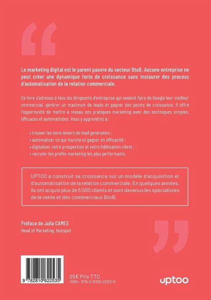 Le marketing btob attire depuis plusieurs années l'intérêt des directions commerciales : quelles actions mettre en place pour générer des leads, de quels outils s'équiper pour prendre le tournant du digital, comment automatiser la prospection ?Aucune entreprise ne peut aujourd'hui créer une dynamique forte de croissance sans instaurer des process d'acquisition et d'automatisation de la relation commerciale. Ce livre s'adresse à tous les dirigeants d'entreprise qui veulent faire de Google leur meilleur commercial et générer un maximum de leads. Il offre l'opportunité de mettre à niveau ses pratiques marketing avec des techniques simples et efficaces pour :- Trouver les bons leviers d'acquisition ;- automatiser ce qui marche et gagner en efficacité ;- digitaliser la prospection et la fidélisation clients ;- recruter les profils marketing les plus performants.