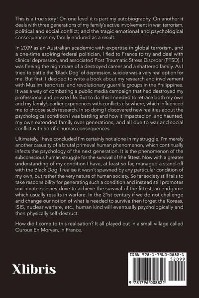 This is a true story! On one level it is part my autobiography. On another it deals with three generations of my family's active involvement in war, terrorism, political and social conflict; and the tragic emotional and psychological consequences my family endured as a result. In 2009 as an Australian academic with expertise in global terrorism, and a one-time aspiring federal politician, I fled to France to try and deal with clinical depression, and associated Post Traumatic Stress Disorder (PTSD). I was fleeing the nightmare of a destroyed career and a shattered family. As I tried to battle the 'Black Dog' of depression, suicide was a very real option for me. But first, I decided to write a book about my research and involvement with Muslim 'terrorists' and revolutionary guerrilla groups in the Philippines. It was a way of combating a public media campaign that had destroyed my professional and private life. But to do this I needed to retrace both my own and my family's earlier experiences with conflicts elsewhere, which influenced me to choose such research. In so doing I discovered new realities about the psychological condition I was battling and how it impacted on, and haunted, my own extended family over generations, and all due to war and social conflict with horrific human consequences. Ultimately, I have concluded I'm certainly not alone in my struggle. I'm merely another casualty of a brutal primeval human phenomenon, which continually infects the psychology of the next generation. It is the phenomenon of the subconscious human struggle for the survival of the fittest. Now with a greater understanding of my condition I have, at least so far, managed a stand-off with the Black Dog. I realise it wasn't spawned by any particular condition of my own, but rather the very nature of human society. So far society still fails to take responsibility for generating such a condition and instead still promotes our innate species drive to achieve the survival of the fittest, an endgame which usually results in warfare. In the 21st century if we do not challenge and change our notion of what is needed to survive then forget the Koreas, ISIS, nuclear warfare, etc., human kind will eventually psychologically and then physically self-destruct. How did I come to this realisation? It all played out in a small village called Ouroux En Morvan, in France.