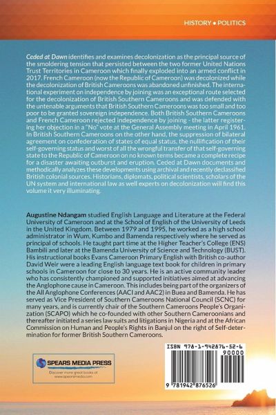 Ceded at Dawn identifies and examines decolonization as the principal source of the smoldering tension that persisted between the two former United Nations Trust Territories in Cameroon which finally exploded into an armed conflict in 2017. French Cameroon (now the Republic of Cameroon) was decolonized while the decolonization of British Cameroons was abandoned unfinished. The international experiment on independence by joining was an exceptional route selected for the decolonization of British Southern Cameroons and was defended with the untenable arguments that British Southern Cameroons was too small and too poor to be granted sovereign independence. Both British Southern Cameroons and French Cameroon rejected independence by joining - the latter registering her objection in a "No" vote at the General Assembly meeting in April 1961. In British Southern Cameroons on the other hand, the suppression of bilateral agreement on confederation of states of equal status, the nullification of their self-governing status and worst of all the wrongful transfer of that self-governing state to the Republic of Cameroon on no known terms became a complete recipe for a disaster awaiting outburst and eruption. Ceded at Dawn documents and methodically analyzes these developments using archival and recently declassified British colonial sources. Historians, diplomats, political scientists, scholars of the UN system and international law as well experts on decolonization will find this volume it very illuminating.