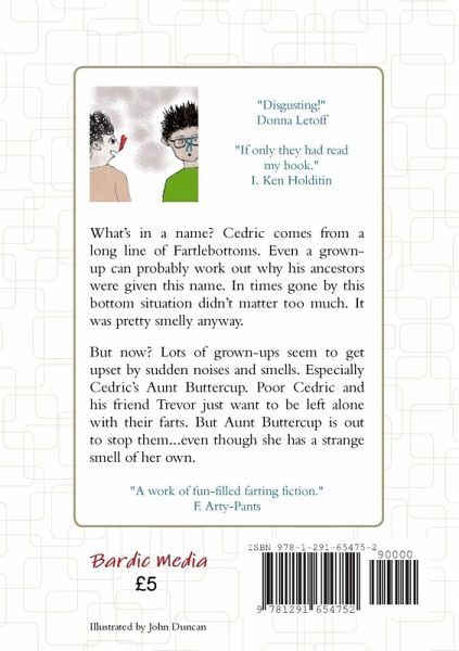 Cedric comes from a long line of Fartlebottoms. Even a grown-up can probably work out why his ancestors were given this name. In times gone by this bottom situation didn't matter too much. It was pretty smelly anyway. But now? Lot's of grown-ups seem to get upset by sudden noises and smells. Especially Cedric's Aunt Buttercup. Poor Cedric and his friend Trevor just want to be left alone with their farts. But Aunt Buttercup is out to stop them...even though she has a strange smell of her own. "Disgusting,' Donna Letoff. "If only they had read my book," I. Ken Holditin. Cedric is written by Ged Duncan and illustrated by his father, John. Ged lives in Dorset and John, or 'JD', lives in London - but despite this they have managed to collaborate on this astonishing contribution to world literature. Ged is also the author of the 'Sydney the Smuggler' trilogy, and John, 'Cricket Wonderful Cricket'. www.smuggles.org www.gedduncan.info www.cricketwonderfulcricket.com