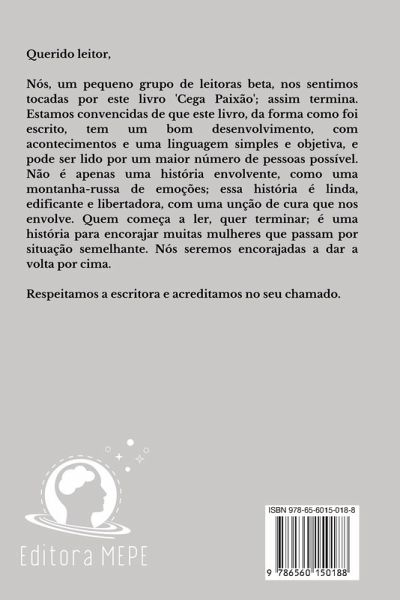 Querido leitor, Nós, um pequeno grupo de leitoras beta, nos sentimos tocadas por este livro Cega Paixão ; assim termina. Estamos convencidas de qu