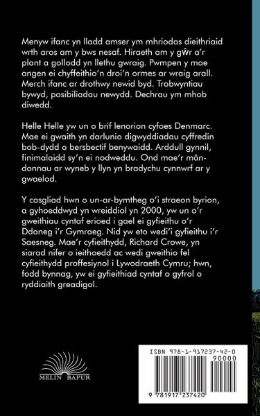 (Welsh Translation of Helle Helle's Danish short story collection Biler og Dyr) Menyw ifanc yn lladd amser ym mhriodas dieithriaid wrth aros am y bws nesaf. Hiraeth am y g¿r a'r plant a gollodd yn llethu gwraig. Pwmpen y mae angen ei chyffeithio'n droi'n ormes ar wraig arall. Merch ifanc ar drothwy newid byd. Trobwyntiau bywyd, posibiliadau newydd. Y diwedd yn aml yn ddechreuad. Helle Helle yw un o brif lenorion cyfoes Denmarc. Mae ei gwaith yn darlunio digwyddiadau cyffredin bob-dydd o bersbectif benywaidd. Arddull gynnil, finimalaidd sy'n ei nodweddu. Ond mae'r tonnau ar wyneb y llyn yn bradychu cynnwrf yn y gwaelodion. Y casgliad hwn o un-ar-bymtheg o'i straeon byrion, a gyhoeddwyd yn wreiddiol yn 2000, yw un o'r gweithiau cyntaf erioed i gael ei gyfieithu o'r Ddaneg i'r Gymraeg. Nid yw eto wedi'i gyfieithu i'r Saesneg. Mae'r cyfieithydd, Richard Crowe, yn siarad nifer o ieithoedd ac wedi gweithio fel cyfieithydd proffesiynol i Lywodraeth Cymru; hwn, fodd bynnag, yw ei gyfieithiad cyntaf o ryddiaith greadigol.