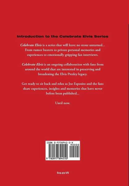 Celebrate Elvis is a series that will leave no stone unturned. ...From rumor busters to private personal memories and experiences to emotionally gripping fan interviews. Celebrate Elvis is an ongoing collaboration with fans from around the world that are interested in preserving and broadening the Elvis Presley legacy. Get ready to sit back and relax as Joe Esposito and the fans share experiences, insights and memories that have never before been published...until now. I want to thank you from the depths of my heart for giving me the "Elvis Fan" insight and truths to the man with the soulful voice. This book is "off the hook" genius. I await patiently for the next one. Joe you are the Elvis fans "Best Friend". - Phyllis Davis
