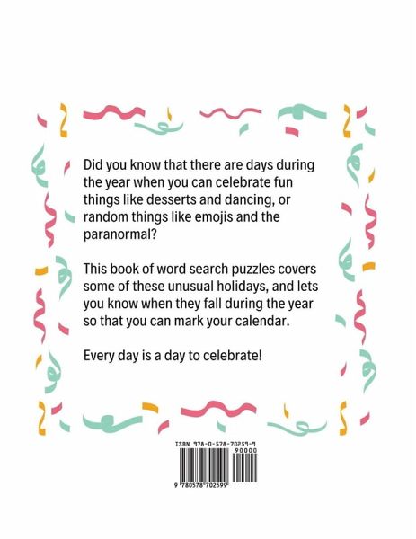 Our calendars are filled with traditional days of observances, but there are also a number of offbeat and unusual events that are now being celebrated. For those who enjoy paying homage to their favorite animal, food, or pop culture subject, this book of themed word search puzzles introduces some of the unique holidays that are out there. In this collection of carefully researched puzzles, each puzzle showcases a weird national day, and contains a list of associated terms for word search enthusiasts to find. With a variety of topics to meet many interests see if your favorite odd day is included in this collection, and discover new ones too!