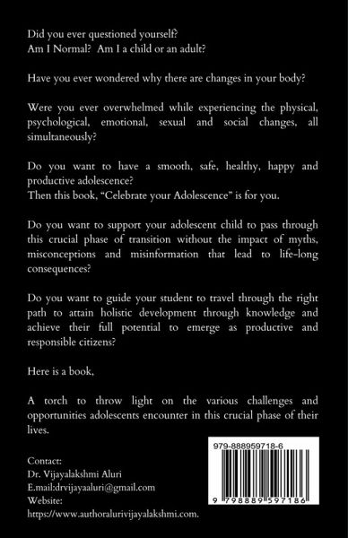 Why Should You Read This Book? Did you ever questioned yourself: ü Am I Normal? ü Am I a child or an adult? ü Have you ever wondered why there are changes in your body? ü Did the changes make you feel embarrassed, scared, or ashamed? ü Were you ever overwhelmed while experiencing the physical, psychological, emotional, sexual, and social changes, all simultaneously? ü Rapid growth. . .Cause of Concern! ü Do you want to have a smooth, safe, healthy, happy and productive adolescence? Then this book, "Celebrate your Adolescence" is for you. Do you want to support your adolescent child to pass through this crucial phase of transition without the impact of myths, misconceptions, and misinformation that lead to life-long consequences? Do you want to guide your student to travel through the right path to attain holistic development through knowledge and achieve their full potential to emerge as productive and responsible citizens? Here is a book, A torch to throw light on the various challenges and opportunities adolescents encounter in this crucial phase of their lives. A resource to provide authentic knowledge for Adolescents, enabling them to make well-informed choices. A tool that helps to build systems and processes to strengthen and promote the positive health of adolescents.