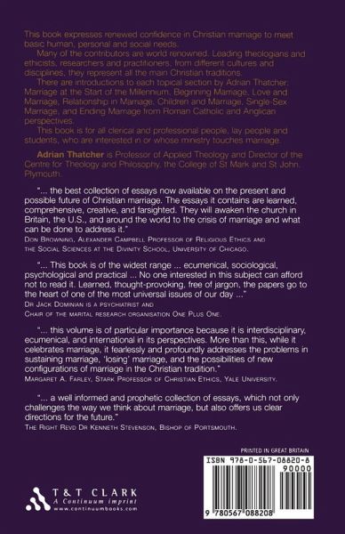 The interest in marriage and the future of marriage is urgent and increasing. This collection of expert research, analysis and discussion may be the most significant ever assembled on this subject. There are contributions from different continents and cultures; from Roman Catholic, Protestant, Anglican and Orthodox traditions; from theologians and many other professionals - including historians, social theorists, sex therapists, lawyers, psychiatrists and demographers - all in conversation with the idea of Christian marriage.There are introductions to each topical section by Adrian Thatcher: Marriage at the Start of the Millennium, Beginning Marriage, Love and Marriage, The Marriage Relationship, Children and Marriage, Single-Sex Marriage, Ending Marriage - Roman Catholic Perspectives, Ending Marriage - Anglican Perspectives.