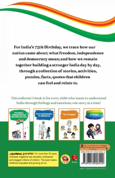 For India's 75th birthday, we trace how our nation came about; what freedom, independence and democracy mean; and how we remain together building a stronger India day by day, through a collection of stories, activities, puzzles, facts, quotes that children can feel and relate to. 75 stories, puzzles, activities, facts and quotes on freedom, Constitution, heroes and festivities. This collector's book is for every child who wants to understand India through feelings and emotions, one story at a time!