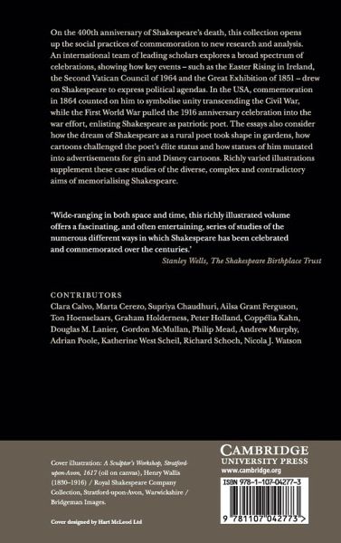 On the 400th anniversary of Shakespeare's death, this collection opens up the social practices of commemoration to new research and analysis. An international team of leading scholars explores a broad spectrum of celebrations, showing how key events - such as the Easter Rising in Ireland, the Second Vatican Council of 1964 and the Great Exhibition of 1851 - drew on Shakespeare to express political agendas. In the USA, commemoration in 1864 counted on him to symbolise unity transcending the Civil War, while the First World War pulled the 1916 anniversary celebration into the war effort, enlisting Shakespeare as patriotic poet. The essays also consider how the dream of Shakespeare as a rural poet took shape in gardens, how cartoons challenged the poet's élite status and how statues of him mutated into advertisements for gin and Disney cartoons. Richly varied illustrations supplement these case studies of the diverse, complex and contradictory aims of memorialising Shakespeare.