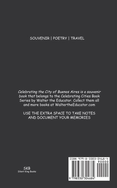 Celebrating the City of Buenos Aires is a little collectible souvenir book that belongs to the Celebrating Cities Book Series by Walter the Educator. USE THE EXTRA SPACE TO TAKE NOTES AND DOCUMENT YOUR MEMORIES. Collect them all and more books at WaltertheEducator.com.