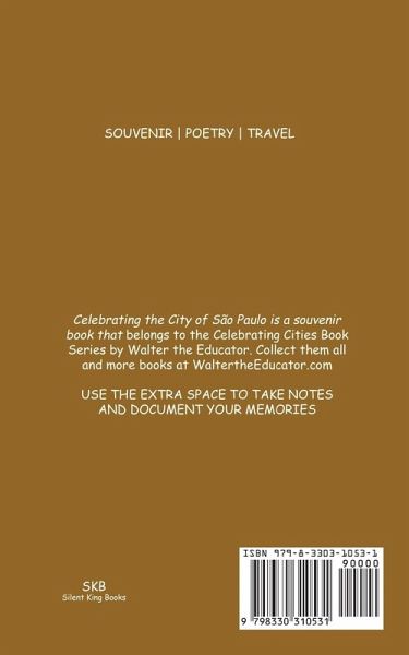 Celebrating the City of São Paulo is a little collectible souvenir book that belongs to the Celebrating Cities Book Series by Walter the Educator. USE THE EXTRA SPACE TO TAKE NOTES AND DOCUMENT YOUR MEMORIES. Collect them all and more books at WaltertheEducator.com.