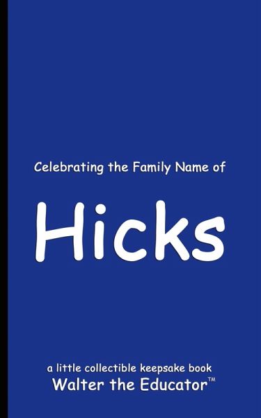 Celebrating the Family Name of Hicks is a memory book that belongs to the Celebrating Family Name Book Series by Walter the Educator. Collect them all and more books at WaltertheEducator.com. USE THE EXTRA SPACE TO DOCUMENT YOUR FAMILY MEMORIES THROUGHOUT THE YEARS