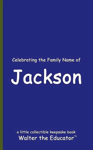 Celebrating the Family Name of Jackson is a memory book that belongs to the Celebrating Family Name Book Series by Walter the Educator. Collect them all and more books at WaltertheEducator.com. USE THE EXTRA SPACE TO DOCUMENT YOUR FAMILY MEMORIES THROUGHOUT THE YEARS