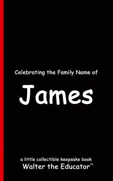 Celebrating the Family Name of James is a memory book that belongs to the Celebrating Family Name Book Series by Walter the Educator. Collect them all and more books at WaltertheEducator.com. USE THE EXTRA SPACE TO DOCUMENT YOUR FAMILY MEMORIES THROUGHOUT THE YEARS