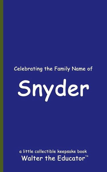 Celebrating the Family Name of Snyder is a memory book that belongs to the Celebrating Family Name Book Series by Walter the Educator. Collect them all and more books at WaltertheEducator.com. USE THE EXTRA SPACE TO DOCUMENT YOUR FAMILY MEMORIES THROUGHOUT THE YEARS