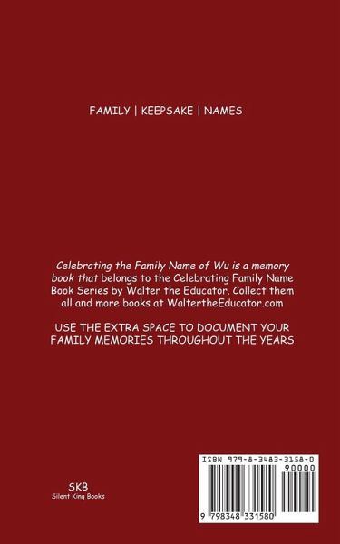Celebrating the Family Name of Wu is a memory book that belongs to the Celebrating Family Name Book Series by Walter the Educator. Collect them all and more books at WaltertheEducator.com. USE THE EXTRA SPACE TO DOCUMENT YOUR FAMILY MEMORIES THROUGHOUT THE YEARS