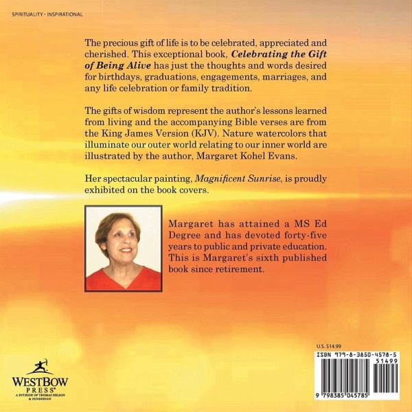 The precious gift of life is to be celebrated, appreciated and cherished. This exceptional book, Celebrating the Gift of Being Alive has just the thoughts and words desired for birthdays, graduations, engagements, marriages, and any life celebration or family tradition. The gifts of wisdom represent the author's lessons learned from living and the accompanying Bible verses are from the King James Version (KJV). Nature watercolors that illuminate our outer world relating to our inner world are illustrated by the author, Margaret Kohel Evans. Her spectacular painting, Magnificent Sunrise, is proudly exhibited on the book covers.