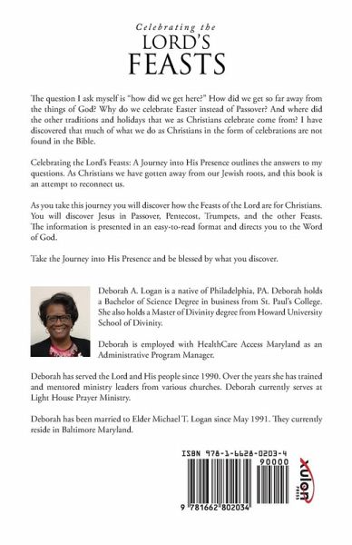 The question I ask myself is "how did we get here?" How did we get so far away from the things of God? Why do we celebrate Easter instead of Passover? And where did the other traditions and holidays that we as Christians celebrate come from? I have discovered that much of what we do as Christians in the form of celebrations are not found in the Bible. Celebrating the Lord's Feasts: A Journey into His Presence outlines the answers to my questions. As Christians we have gotten away from our Jewish roots, and this book is an attempt to reconnect us. As you take this journey you will discover how the Feasts of the Lord are for Christians. You will discover Jesus in Passover, Pentecost, Trumpets, and the other Feasts. The information is presented in an easy-to-read format and directs you to the Word of God. Take the Journey into His Presence and be blessed by what you discover. Deborah A. Logan is a native of Philadelphia, PA. Deborah holds a Bachelor of Science Degree in business from St. Paul's College. She also holds a Master of Divinity degree from Howard University School of Divinity. Deborah is employed with HealthCare Access Maryland as an Administrative Program Manager. Deborah has served the Lord and His people since 1990. Over the years she has trained and mentored ministry leaders from various churches. Deborah currently serves at Light House Prayer Ministry. Deborah has been married to Elder Michael T. Logan since May 1991. They currently reside in Baltimore Maryland.
