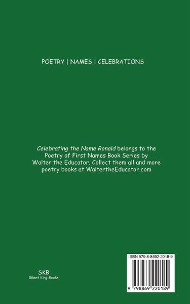 Celebrating the Name Ronald is a little collectible poem book that belongs to the Poetry of First Names Book Series by Walter the Educator. Collect them all and more poetry books at WaltertheEducator.com. This book is dedicated to everyone with the first name of Ronald.