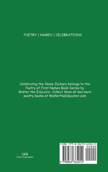 Celebrating the Name Zachary is a little collectible poem book that belongs to the Poetry of First Names Book Series by Walter the Educator. Collect them all and more poetry books at WaltertheEducator.com. This book is dedicated to everyone with the first name of Zachary.