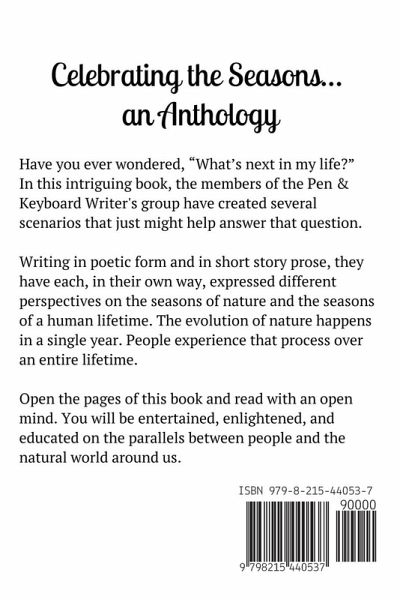 Pen & Keyboard Writers is a writing club affiliated with the Oklahoma Writers Federation, Inc. Members of Pen & Keyboard Writers are authors of published and unpublished novels, short stories, children's books, poetry, and non-fiction. They have a wide variety of interests and experiences, but what they share is curiosity, enthusiasm and support for their fellow writers, and a love of writing. This book is a collection of poems and short stories that celebrate the seasons - both the four seasons of nature and the parallel "seasons" of a human lifetime. The Pen & Keyboard Writers hope that you enjoy reading their work. Regardless of the number of candles on your birthday cake, their wish is that you may have in your life all the gifts to be presented by each season.