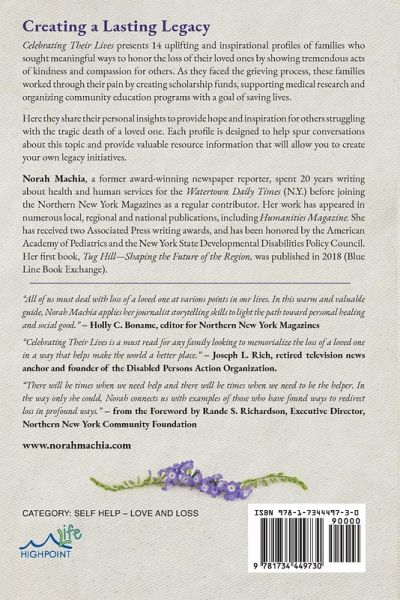 Create a Lasting Legacy 2022 Independent Press Award Winner! ¿Celebrating Their Lives presents 14 uplifting and inspirational profiles of families who sought meaningful ways to honor the loss of their loved ones by showing tremendous acts of kindness and compassion for others. As they faced the grieving process, these families worked through their pain by creating scholarship funds, supporting medical research and organizing community education programs with a goal of saving lives. Here they share their personal insights to provide hope and inspiration for others struggling with the tragic death of a loved one. By creating meaningful legacies, these families found comfort in their healing journeys and were given a lifelong opportunity to share the values and beliefs of those who passed away. Each profile is designed to help spur conversations about this topic and provide valuable resource information that will allow you to create your own legacy initiatives. ______________________________________________ "Norah Machia's real-life stories of loss brim with humanity, while offering multiple paths for turning those losses into positive legacies." - Margot C. Jacoby, bereaved mother, college professor and author of Love Lives - Becoming Martha O'Neill "All of us must deal with loss of a loved one at various points in our lives. In this warm and valuable guide, Norah Machia applies her journalist storytelling skills to light the path toward personal healing and social good." - Holly C. Boname, editor for Northern New York Magazines "Celebrating Their Lives is a must read for any family looking to memorialize the loss of a loved one in a way that helps make the world a better place." - Joseph L. Rich, retired television news anchor and founder of the Disabled Persons Action Organization. "There will be times when we need help and there will be times when we need to be the helper. In the way only she could, Norah connects us with examples of those who have found ways to redirect loss in profound ways." - from the Foreword by Rande S. Richardson, Executive Director, Northern New York Community Foundation www.norahmachia.com CATEGORY: SELF HELP - LOVE AND LOSS