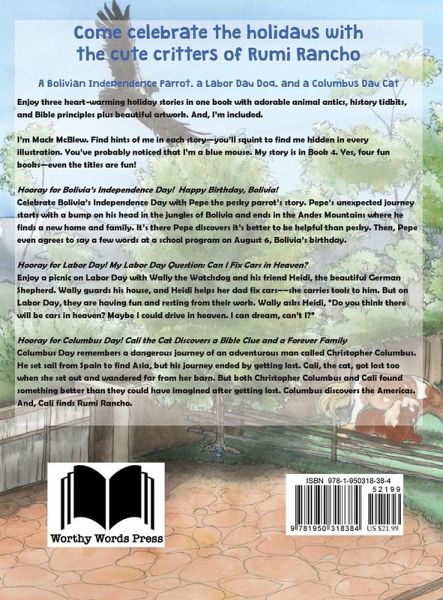 Enjoy three heart-warming holiday stories in one book with adorable animal antics, history tidbits, and Bible principles plus beautiful artwork. And, I'm included. I'm Mack McBlew. Find hints of me in each story-you'll squint to find me hidden in every illustration. You've probably noticed that I'm a blue mouse. My story is in Book 4. Yes, four fun books-even the titles are fun! Hooray for Bolivia's Independence Day! Happy Birthday, Bolivia! Celebrate Bolivia's Independence Day with Pepe the pesky parrot's story. Pepe's unexpected journey starts with a bump on his head in the jungles of Bolivia and ends in the Andes Mountains where he finds a new home and family. It's there Pepe discovers it's better to be helpful than pesky. Then, Pepe even agrees to say a few words at a school program on August 6, Bolivia's birthday. Hooray for Labor Day! My Labor Day Question: Can I Fix Cars in Heaven? Enjoy a picnic on Labor Day with Wally the Watchdog and his friend Heidi, the beautiful German Shepherd. Wally guards his house, and Heidi helps her dad fix cars--she carries tools to him. But on Labor Day, they are having fun and resting from their work. Wally asks Heidi, "Do you think there will be cars in heaven? Maybe I could drive in heaven. I can dream, can't I?" Hooray for Columbus Day! Cali the Cat Discovers a Bible Clue and a Forever Family Columbus Day remembers a dangerous journey of an adventurous man called Christopher Columbus. He set sail from Spain to find Asia, but his journey ended by getting lost. Cali, the cat, got lost too when she set out and wandered far from her barn. But both Christopher Columbus and Cali found something better than they could have imagined after getting lost. Columbus discovers the Americas. And, Cali finds Rumi Rancho.