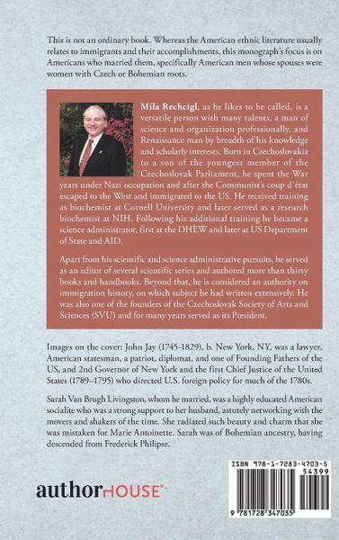 This is not an ordinary book. Whereas the American ethnic literature usually relates to immigrants and their accomplishments, this monograph's focus is on Americans who married them, specifically American men whose spouses were women with Czech or Bohemian roots. Images on the cover: John Jay (1745-1829), b. New York, NY, was a lawyer, American statesman, a patriot, diplomat, and one of Founding Fathers of the US, and 2nd Governor of New York and the first Chief Justice of the United States (1789-1795) who directed U.S. foreign policy for much of the 1780s. Sarah Van Brugh Livingston, whom he married, was a highly educated American socialite who was a strong support to her husband, astutely networking with the movers and shakers of the time. She radiated such beauty and charm that she was mistaken for Marie Antoinette. Sarah was of Bohemian ancestry, having descended from Frederick Philipse.