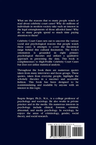 This book sets out to uncover the range of the reasons that people watch, read about, or otherwise follow celebrity court cases in the media. Celebrity Court Cases focuses on eight primary social and psychological theories and utilizes a qualitative approach in presenting the data. It is a complimentary to High-Profile Celebrity Court Cases but does not employ any statistical analysis. The book is designed to be accessible and nonintimidating for any reader interested in this cultural fascination.
