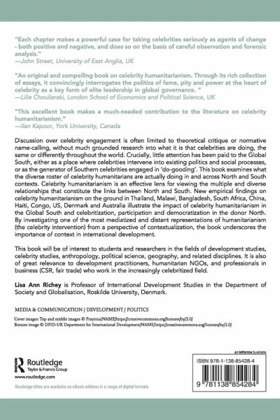 Discussion over celebrity engagement is often limited to theoretical critique or normative name-calling, without much grounded research into what it is that celebrities are doing, the same or differently throughout the world. Crucially, little attention has been paid to the Global South, either as a place where celebrities intervene into existing politics and social processes, or as the generator of Southern celebrities engaged in 'do-gooding'. This book examines what the diverse roster of celebrity humanitarians are actually doing in and across North and South contexts. Celebrity humanitarianism is an effective lens for viewing the multiple and diverse relationships that constitute the links between North and South. New empirical findings on celebrity humanitarianism on the ground in Thailand, Malawi, Bangladesh, South Africa, China, Haiti, Congo, US, Denmark and Australia illustrate the impact of celebrity humanitarianism in the Global South and celebritization, participation and democratization in the donor North. By investigating one of the most mediatized and distant representations of humanitarianism (the celebrity intervention) from a perspective of contextualization, the book underscores the importance of context in international development. This book will be of interest to students and researchers in the fields of development studies, celebrity studies, anthropology, political science, geography, and related disciplines. It is also of great relevance to development practitioners, humanitarian NGOs, and professionals in business (CSR, fair trade) who work in the increasingly celebritized field.