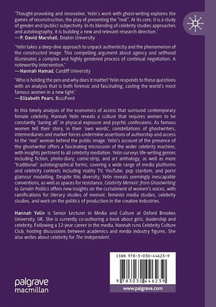 In this timely analysis of the economics of access that surround contemporary female celebrity, Hannah Yelin reveals a culture that requires women to be constantly 'baring all' in physical exposure and psychic confessions. As famous women tell their story, in their 'own words', constellations of ghostwriters, intermediaries and market forces undermine assertions of authorship and access to the 'real' woman behind the public image. Yelin's account of the presence of the ghostwriter offers a fascinating microcosm of the wider celebrity machine, with insights pertinent to all celebrity mediation. Yelin surveys life-writing genres including fiction, photo-diary, comic-strip, and art anthology, as well as more 'traditional' autobiographical forms; covering a wide range of media platforms and celebrity contexts including reality TV, YouTube, pop stardom, and porn/glamour modelling. Despite this diversity, Yelin reveals seemingly inescapable conventions, as well as spaces for resistance.Celebrity Memoir: from Ghostwriting to Gender Politics offers new insights on the curtailment of women's voices, with ramifications for literary studies of memoir, feminist media studies, celebrity studies, and work on the politics of production in the creative industries.