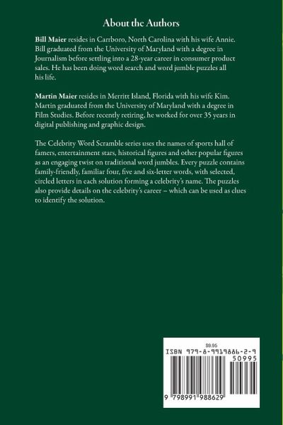 The Celebrity Word Scramble series uses the names of sports hall of famers, entertainment stars, historical figures and other popular figures as an engaging twist on traditional word jumbles. Every puzzle contains family-friendly, familiar four, five and six-letter words, with selected, circled letters in each solution forming a celebrity's name. The puzzles also provide details on the celebrity's career - which can be used as clues to identify the solution. CWS At the ZOO! offers 118 puzzles on an assortment of arthropods, mammals, reptiles and birds that you will encounter on your visit to the zoo. From the platypus to the playground, you are sure to enjoy these challenging and fun word scrambles while perhaps learning something new. Biographical clues are provided to help in solving the puzzle but we recommend having a 3X5 card to block the clues until you really need them. Enjoy!