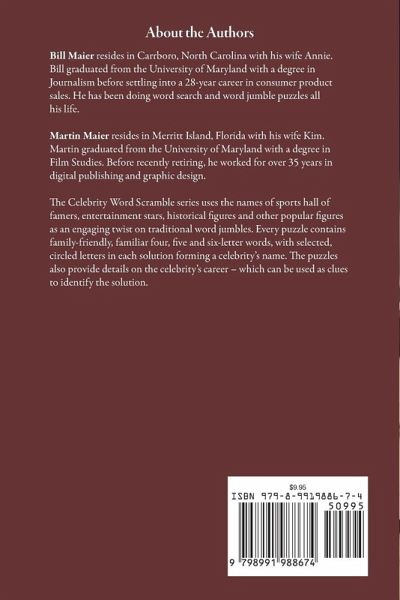 The Celebrity Word Scramble series uses the names of sports hall of famers, entertainment stars, historical figures and other popular figures as an engaging twist on traditional word jumbles. Every puzzle contains family-friendly, familiar four, five and six-letter words, with selected, circled letters in each solution forming a celebrity's name. The puzzles also provide details on the celebrity's career - which can be used as clues to identify the solution. CWS Famous Authors offers 109 puzzles on the greatest authors of all-time. From Miguel de Cervantes to Toni Morrison, CWS Famous Authors celebrates the notable authors who penned the most recognizable works of fiction in history. You are sure to enjoy these challenging and fun word scrambles while perhaps learning something new. Biographical clues are provided to help in solving the puzzle but we recommend having a 3X5 card to block the clues until you really need them. Enjoy!