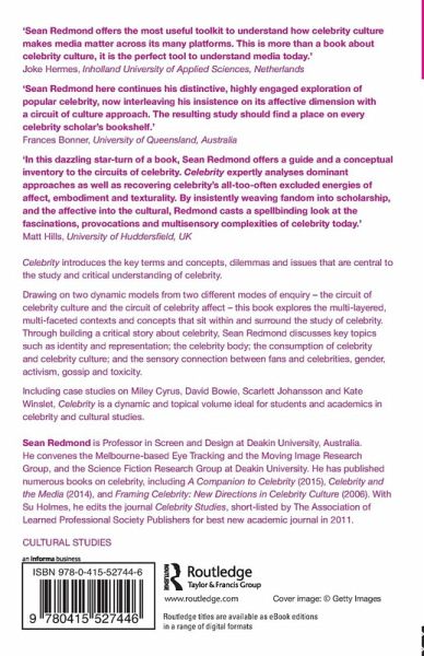 'In this dazzling star-turn of a book, Sean Redmond offers a guide and a conceptual inventory to the circuits of celebrity. Celebrity expertly analyses dominant approaches as well as recovering celebrity's all-too-often excluded energies of affect, embodiment and texturality. By insistently weaving fandom into scholarship, and the affective into the cultural, Redmond casts a spellbinding look at the fascinations, provocations and multisensory complexities of celebrity today.'