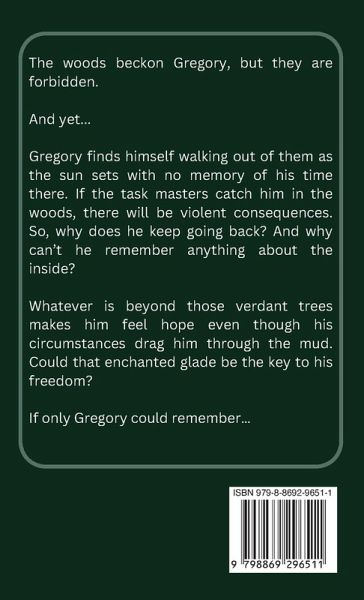 The woods beckon Gregory, but they are forbidden. And yet... Gregory finds himself walking out of them as the sun sets with no memory of his time there. If the task masters catch him in the woods, there will be violent consequences. So, why does he keep going back? And why can't he remember anything about the inside? Whatever is beyond those verdant trees makes him feel hope even though his circumstances drag him through the mud. Could that enchanted glade be the key to his freedom? If only Gregory could remember...