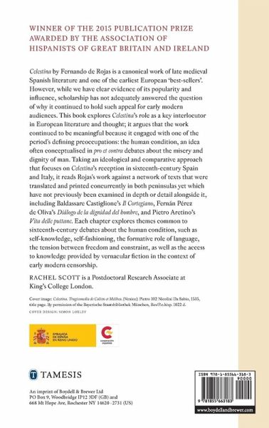 Winner of the 2015 Publication Prize awarded by the Association of Hispanists of Great Britain and Ireland. Celestina by Fernando de Rojas is a canonical work of late medieval Spanish literature and one of the earliest European "best-sellers." However, while we have clear evidence of its popularity and influence, scholarship has not adequately answered the question of why it continued to hold such appeal for early modern audiences. This book explores Celestina's role as a key interlocutor in European literature and thought; it argues that the work continued to be meaningful because it engaged with one of the period's defining preoccupations: the human condition, an idea often conceptualised in pro et contra debates about the misery and dignity of man. Taking an ideological and comparative approach that focuses on Celestina's reception in sixteenth-century Spain and Italy, it reads Rojas's work against a network of texts that were translated and printed concurrently in both peninsulas yet which have not previously been examined in depth or detail alongside it, including Baldassare Castiglione's Il Cortegiano, Fernan Perez de Oliva's Dialogo de la dignidad del hombre, and Pietro Aretino's Vita delle puttane. Each chapter explores themes common to sixteenth-century debates about the human condition, such as self-knowledge, self-fashioning, the formative role of language, the tension between freedom and constraint, as well as the access to knowledge provided by vernacular fiction in the context of early modern censorship. Rachel Scott is a Postdoctoral Research Associate at King's College London.