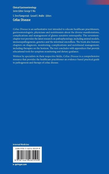 Introduction.- Definition of Celiac Disease and Gluten Sensitivity.- Epidemiology of Celiac Disease.- The Pathophysiology of Celiac Disease.- Immunogenetics of Celiac Disease.- Using Animal Models of Celiac Disease to Understand the Role of MHC II.- Role of Gut Microbes in Celiac Disease Risk and Pathogenesis.- Presentation of Celiac Disease in Children and Adults.- Diagnosis of Celiac Disease.- Nutrition in Celiac Disease.- Dietary Supplements in Celiac Disease.- Monitoring and Follow-up of Patients with Celiac Disease.- Special Considerations in Children and Young Adults with Celiac Disease.- Novel and Experimental Therapies on the Horizon.- Morbidity and Mortality Associated with Celiac Disease.- Refractory Celiac Disease.- Celiac Disease: Dispelling Misconceptions and Myths.- Summary of Recommendations from the American College of Gastroenterology Celiac Disease Guidelines.- Resources for Celiac Disease Practitioners and Patients.- Taxonomic Relationships of the Major Cereal Grains.- Some Potential Sources of Hidden Gluten.- Key Elements in the Management of Celiac Disease.- Celiac Iceberg.- An Approach to Gluten Challenge for the Diagnosis or Exclusion of Celiac Disease.- An Approach to the Monitoring of Celiac Disease.- An Approach to the Diagnosis of Celiac Disease.- An Approach to the Patient with Non-Responsive Celiac Disease.- Dietary Reference Intakes (DRIs): Recommended Dietary Allowance and Adequate Intakes, Vitamins and Elements.- Dietary Reference Intakes (DRIs): Tolerable Upper Intake Levels, Vitamins and Elements.