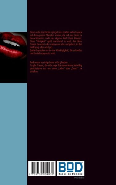 Die Geschichte spiegelt das Leiden vieler Frauen auf dem ganzen Planeten wieder, die sich aus Liebe zu ihren Männern, nicht aus eigener Kraft lösen können. Diese "Hörigkeit" geht manchmal so weit, dass diese Frauen bewusst oder unbewusst alles aufgeben, in der Hoffnung, das alles gut wird. Dadurch geraten sie in eine Abhängigkeit, die schamlos und brutal ausgenutzt wird.Auch wenn es einige Leser nicht glauben............Es gibt Frauen, die sich sogar für einen Mann freiwillig prostituieren nur um seine "Liebe" oder "Gunst" zu erhalten.