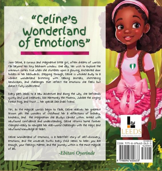 CELINE'S WONDERLAND OF EMOTION Join Celine, a curious and imaginative little girl, often dreams of worlds far beyond her tiny bedroom window. One day, her wish to explore the unknown comes true when she stumbles upon a glowing, enchanted door hidden in her backwards. Stepping through, Celine is whisked away to a vibrant wonderland brimming with talking animals, shimmering landscapes, and challenges that reflect the emotions she feels but doesn't fully understand. Every path leads to a new adventure and along the way, she befriends quirky and wise creatures, like Harmoney the Phoenix, Jubilee the singing Forest Frog, and Trust ... her special Sea Snail friend. Yet, as the magical worlds begin to fade, Celine realizes her greatest lesson yet: the wonders of childhood her a reflections of bravery, kindness, and the imagination she always carried within. Armed with newfound confidence and understanding, Celine returns home forever changed-ready to navigate her real-world challenges with the magic and newfound knowledge at heart. Celine Wonderland of Emotions, is a heartfelt story of self-discovery, emotions, and the universal truths every child needs to hear: you are enough, your feelings matter, and the journey within is the most magical of all.