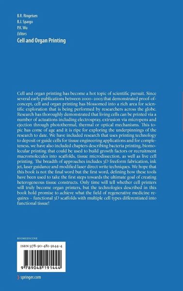 Cell and organ printing has become a hot topic of scientific pursuit. Since several early publications between 2000-2003 that demonstrated proof-of-concept, cell and organ printing has blossomed into a rich area for scientific exploration that is being performed by researchers across the globe. Research has thoroughly demonstrated that living cells can be printed via a number of actuations including electrospray, extrusion via micropens and ejection through photothermal, thermal or optical mechanisms. This topic has come of age and it is ripe for exploring the underpinnings of the research to date. We have included research that uses printing technology to deposit or guide cells for tissue engineering applications and for completeness, we have also included chapters describing bacteria printing, biomolecular printing that could be used to build growth factors or recruitment macromolecules into scaffolds, tissue microdissection, as well as live cell printing. The breadth of approaches includes 3D freeform fabrication, ink jet, laser guidance and modified laser direct write techniques. We hope that this book is not the final word but the first word, defining how these tools have been used to take the first steps towards the ultimate goal of creating heterogeneous tissue constructs. Only time will tell whether cell printers will truly become organ printers, but the technologies described in this book hold promise to achieve what the field of regenerative medicine requires - functional 3D scaffolds with multiple cell types differentiated into functional tissue!
